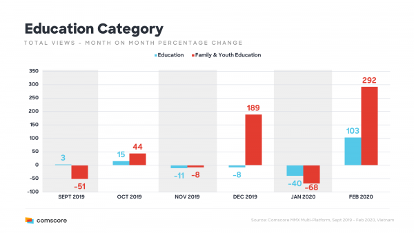 Tổng số lượt xem về danh mục Giáo dục đã tăng 103% vào tháng 2 so với tháng 1 năm 2020.