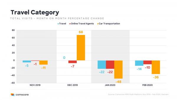 Vào tháng 2 năm 2020, chính phủ Việt Nam đã thực hiện các hạn chế đi lại (đình chỉ các chuyến bay đến và đi từ Trung Quốc, với các hạn chế về thị thực) để giảm lây truyền vi-rút. Với những hạn chế trong việc đi lại và do những người ở nhà, loại Du lịch đã giảm 14% số lượt truy cập vào tháng 2 năm 2020 so với tháng 1 năm 2020.