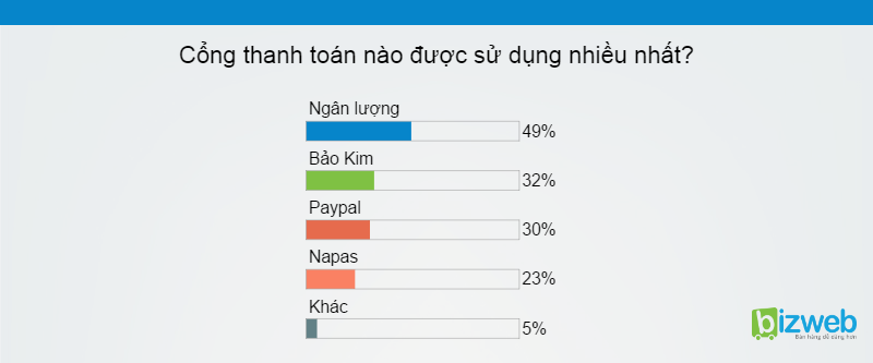Tích hợp thanh toán trực tuyến là một xu hướng “cần” và “đủ” trong thời buổi kinh doanh hiện đại nhờ sự phát triển bền vững của nền TMĐT. Theo thống kê của Bizweb, trong tổng số 7,6% website bán hàng tích hợp thanh toán trực tuyến, có gần 50% đang tích hợp cổng Ngân Lượng, tiếp đến là Bảo Kim (32%), Paypal (30%), Napas (23%), các cổng thanh toán khác chỉ chiếm trên 5%.