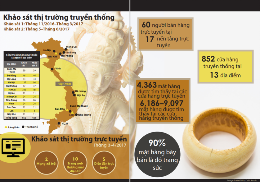 Báo cáo “Từ ngà voi tới trang sức: Thị trường ngà voi bất hợp pháp tồn tại dai dẳng tại Việt Nam” cung cấp kết quả khảo sát về ngà voi và các sản phẩm từ ngà voi được buôn bán tại 852 cơ sở kinh doanh tại 13 tỉnh, thành phố và 60 cửa hàng online đang hoạt động trên 17 diễn dàn trực tuyến trong khoảng thời gian từ tháng 11/2016 đến tháng 06/2017.
