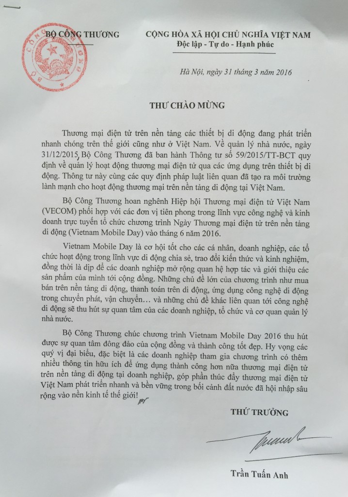 Ngày Thương mại điện tử trên nền tảng di động – Vietnam Mobile Day 2016 (diễn ra vào tháng 6 năm 2016) đã nhận được thư chào mừng của Bộ Công Thương. Thay mặt Bộ Công Thương, Thứ trưởng Ông Trần Tuấn Anh hoan nghênh Hiệp hội Thương mại điện tử Việt Nam phối hợp với các đơn vị tiên phong trong lĩnh vực công nghệ và kinh doanh trực tuyến tổ chức thành công chương trình, thu hút được sự quan tâm đông đảo của cộng đồng.