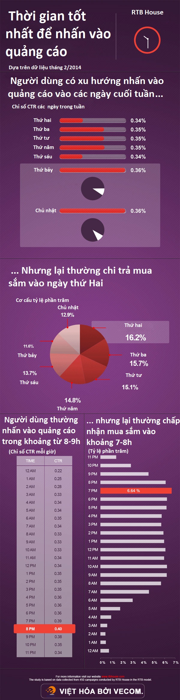 Kết quả cho thấy người dùng nhấp vào quảng cáo thường xuyên nhất trong các ngày thứ Bảy và Chủ Nhật, cho thấy CTR (mối quan hệ giữa số lần nhấp chuột và hiển thị quảng cáo) ở 0,36% . Hoạt động cao nhất được ghi nhận từ 3 đến 5 giờ chiều (CTR : 0,41% ).