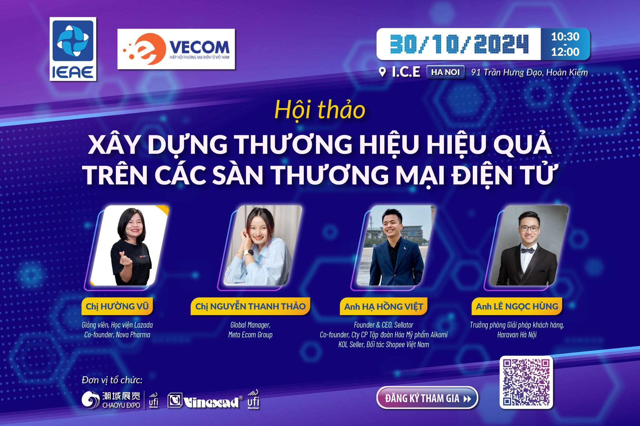 Hiệp hội Thương mại điện tử Việt Nam (VECOM) phối hợp cùng Công ty VINEXAD và Chaoyu (Trung Quốc) sẽ tổ chức Hội thảo “Xây dựng thương hiệu hiệu quả trên các sàn TMĐT” kết hợp với kết nối B2B giữa các doanh nghiệp Việt Nam và Trung Quốc trong lĩnh vực điện tử và thiết bị thông minh tại Triển lãm Quốc tế Điện tử và Thiết bị thông minh Việt Nam 2024 (IEAE).