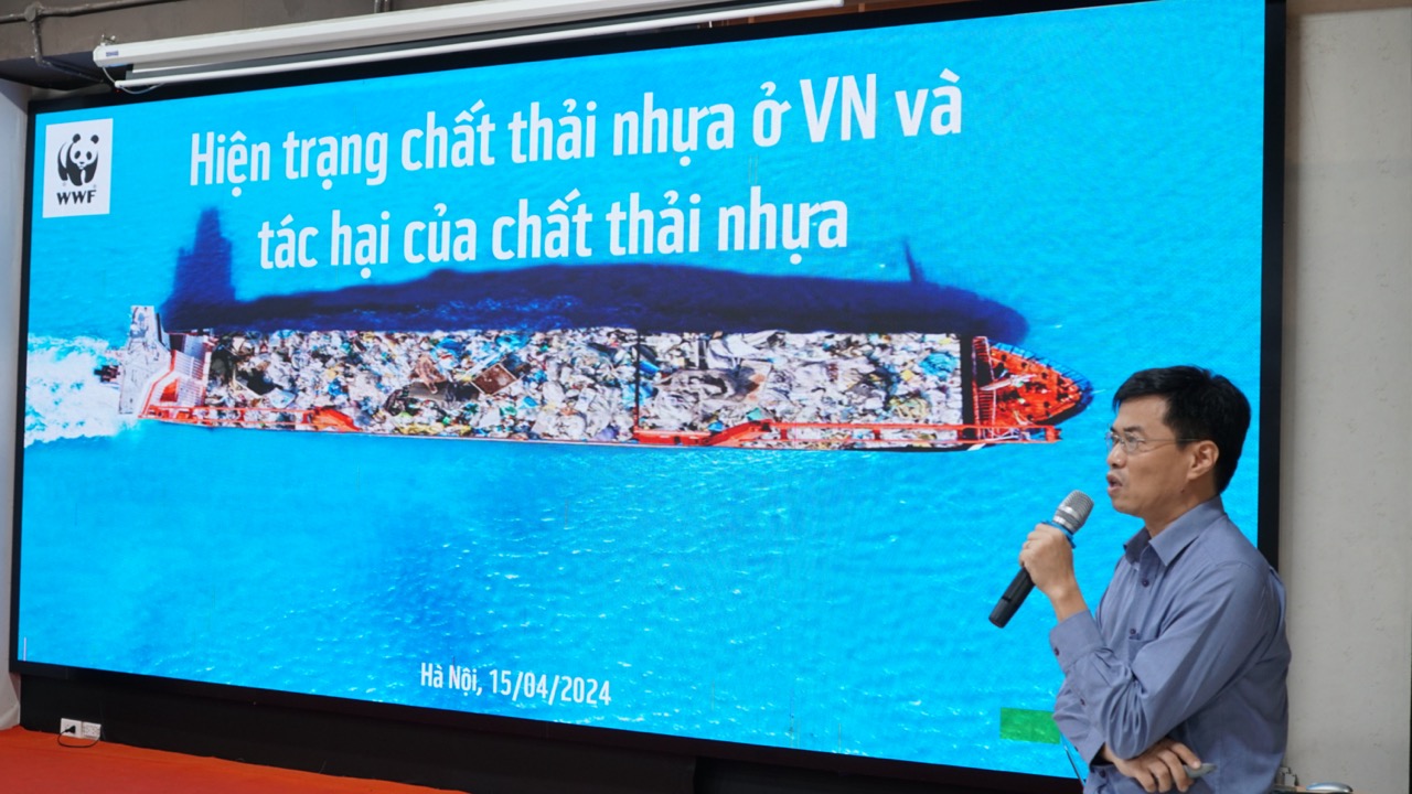 Tiến Sĩ Phạm Mạnh Hoài- Quản lý Hợp phần Đối tác và Chính sách, Chương trình Giảm nhựa của Tổ chức Quốc tế về Bảo tồn Thiên nhiên tại Việt Nam (WWF) chia sẻ tại sự kiện