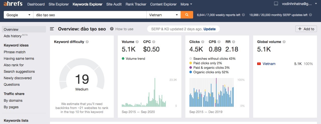 Ahref’s Keyword Generator lấy 100 ý tưởng từ khóa hàng đầu cho bất kỳ từ khóa hoặc cụm từ gốc nào từ cơ sở dữ liệu của Ahref’s với hơn mười tỷ từ khóa trên hơn 170 quốc gia. Nó hiển thị khối lượng tìm kiếm ước tính hàng tháng cho mỗi từ khoá đề xuất, cộng với điểm độ khó của từ khóa ( KD).