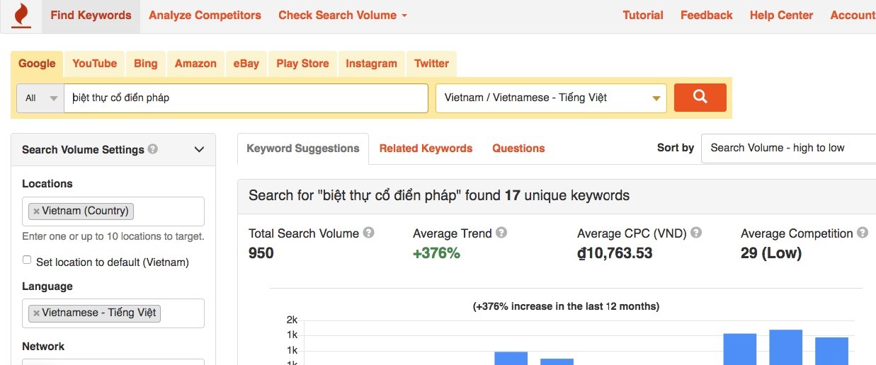 Keyword Tool sẽ giúp bạn khám phá hàng nghìn từ khoá dài mới liên quan đến bất kỳ chủ đề nào bằng cách tự động tạo các đề xuất tìm kiếm của Google, Bing, Amazon, Ebay…. Các đề xuất từ khóa sẽ được tạo dựa trên vùng miền và ngôn ngữ mà bạn chọn.