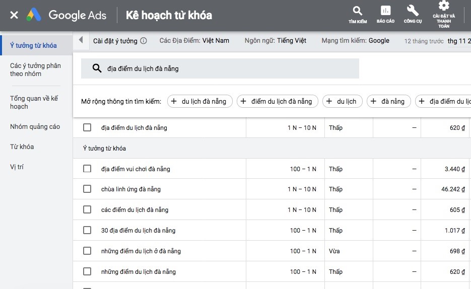 Google Keyword Planner là công cụ nghiên cứu từ khóa của Google. Sử dụng nó để tạo ý tưởng từ khóa dựa trên tối đa mười từ khóa gốc, hoặc từ một trang web hoặc URL.