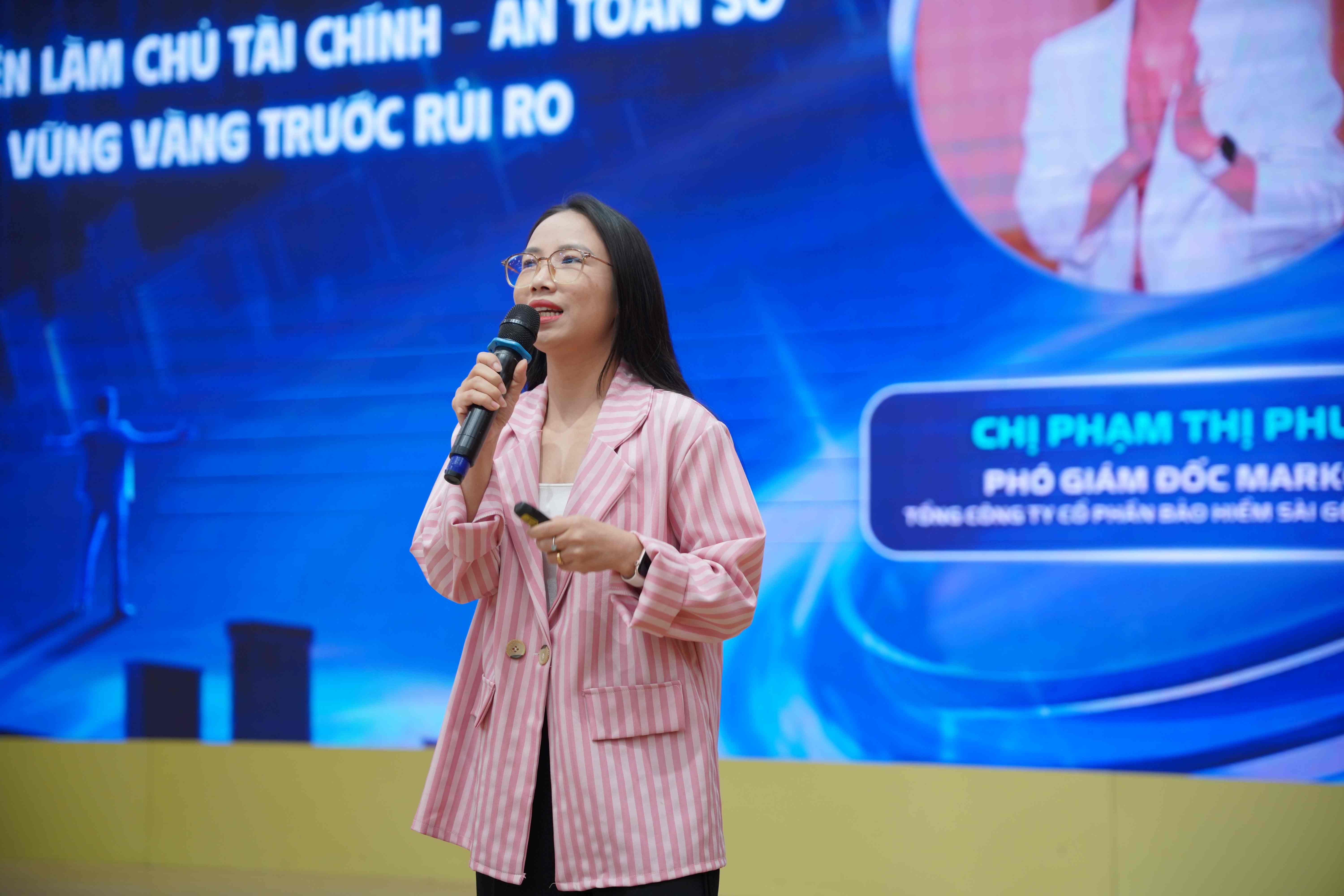 Trong bài chia sẻ, chị Phạm Thị Phương, Phó Giám đốc Marketing Tổng Công ty Cổ phần Bảo hiểm Sài Gòn - Hà Nội đã đưa ra những lời khuyên thiết thực giúp sinh viên biết cách quản lý tài chính cá nhân một cách khoa học, đồng thời cảnh giác trước những rủi ro trên môi trường số. Từ câu chuyện chi tiêu hợp lý, lập kế hoạch tài chính đến các vấn đề an toàn khi giao dịch trực tuyến, chị đã cung cấp cho sinh viên kiến thức nền tảng để bảo vệ bản thân và chủ động hơn trong quản lý tài chính. Đây là kỹ năng thiết yếu không chỉ trong thời sinh viên mà còn cho sự nghiệp lâu dài sau này.