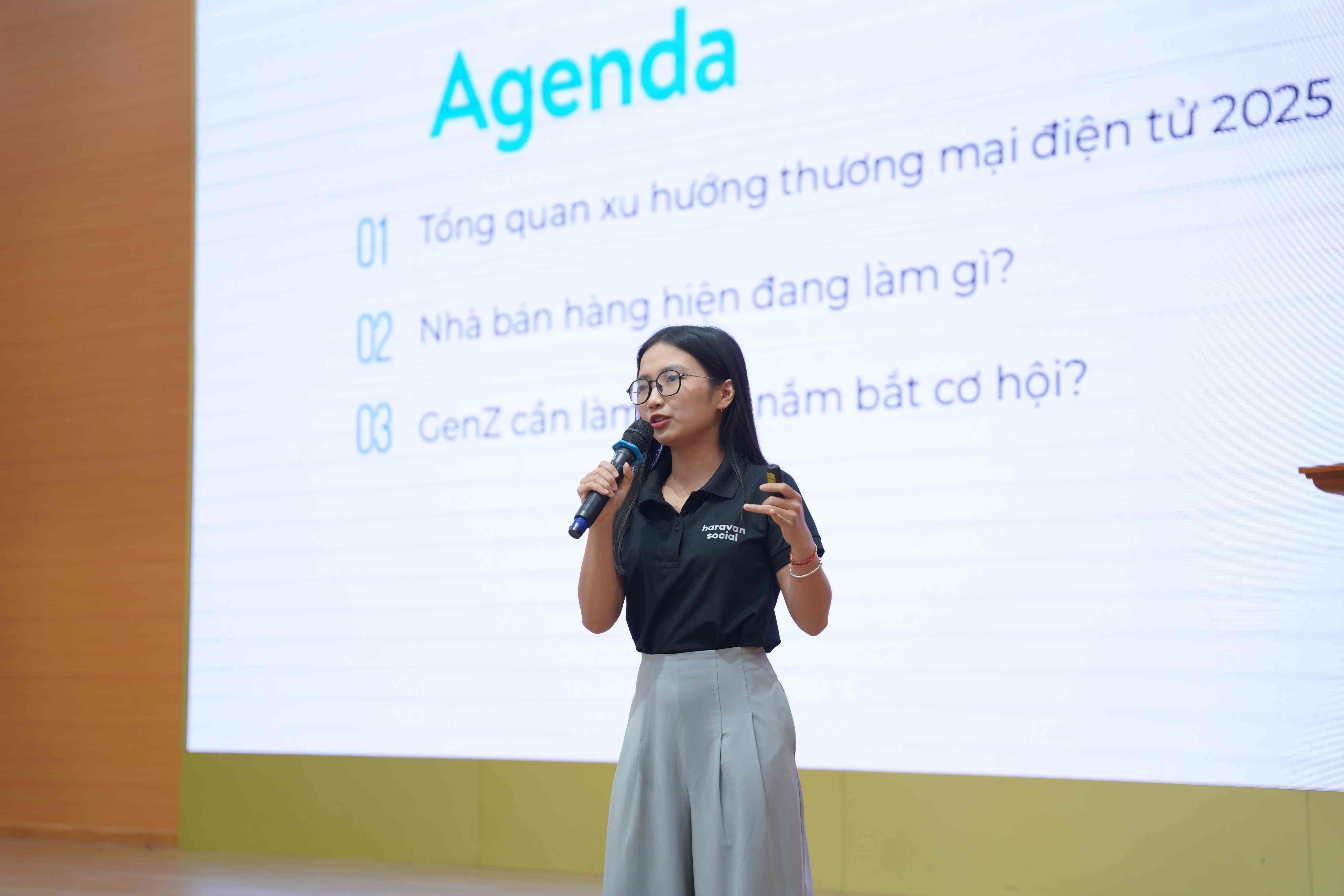 Trong phần chia sẻ về “Xu hướng thương mại điện tử – GenZ cần làm gì để nắm bắt cơ hội”, chị Thái Thị Xuân Mỹ – Trưởng phòng Giải pháp Khách hàng tại Haravan đã mang đến nhiều góc nhìn thiết thực về sự phát triển nhanh chóng của thương mại điện tử. Chị nhấn mạnh, GenZ không chỉ là thế hệ tiêu dùng mới mà còn là lực lượng tiên phong khởi nghiệp, sáng tạo và kinh doanh trên nền tảng số. Để nắm bắt cơ hội, các bạn trẻ cần trang bị tư duy linh hoạt, am hiểu công nghệ, cùng kỹ năng triển khai bán hàng và marketing trực tuyến hiệu quả. Đây chính là hành trang quan trọng giúp GenZ khẳng định dấu ấn và bứt phá trong kỷ nguyên số.