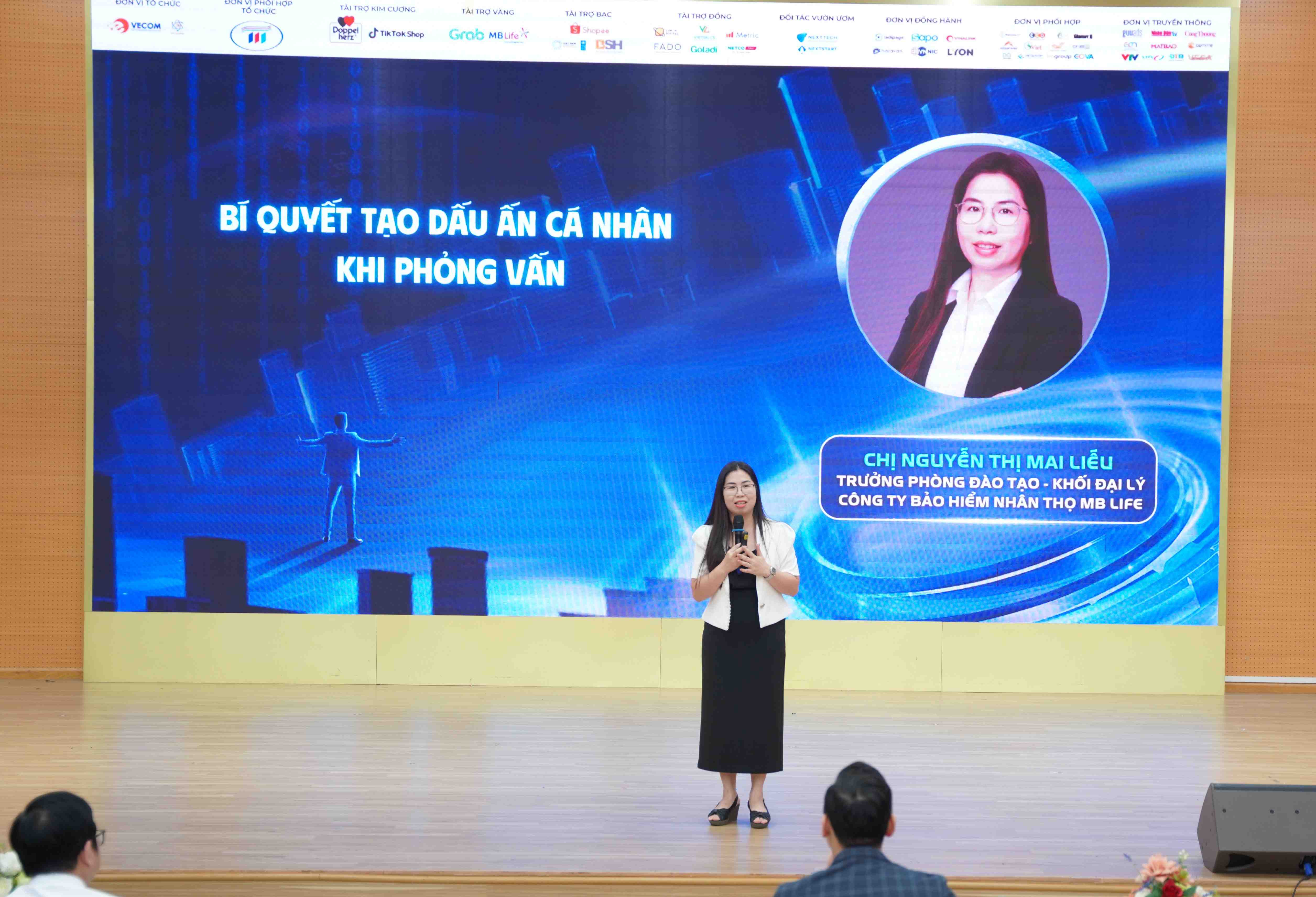 Trong chuyên đề “Bí quyết tạo dấu ấn cá nhân khi phỏng vấn”, chị Nguyễn Thị Mai Liễu — Trưởng phòng Đào tạo, Khối đại lý, MB Life — đã chia sẻ những chiến lược thực tiễn giúp sinh viên nổi bật trước nhà tuyển dụng. Bên cạnh kỹ năng trả lời, chị nhấn mạnh việc công tác chuẩn bị kỹ càng, xây dựng hình ảnh chuyên nghiệp và trình bày giá trị cá nhân một cách rõ ràng. Những mẹo thiết thực này không chỉ giúp ứng viên ghi điểm trong buổi phỏng vấn mà còn tạo nền tảng bền vững cho sự phát triển nghề nghiệp trong môi trường cạnh tranh.