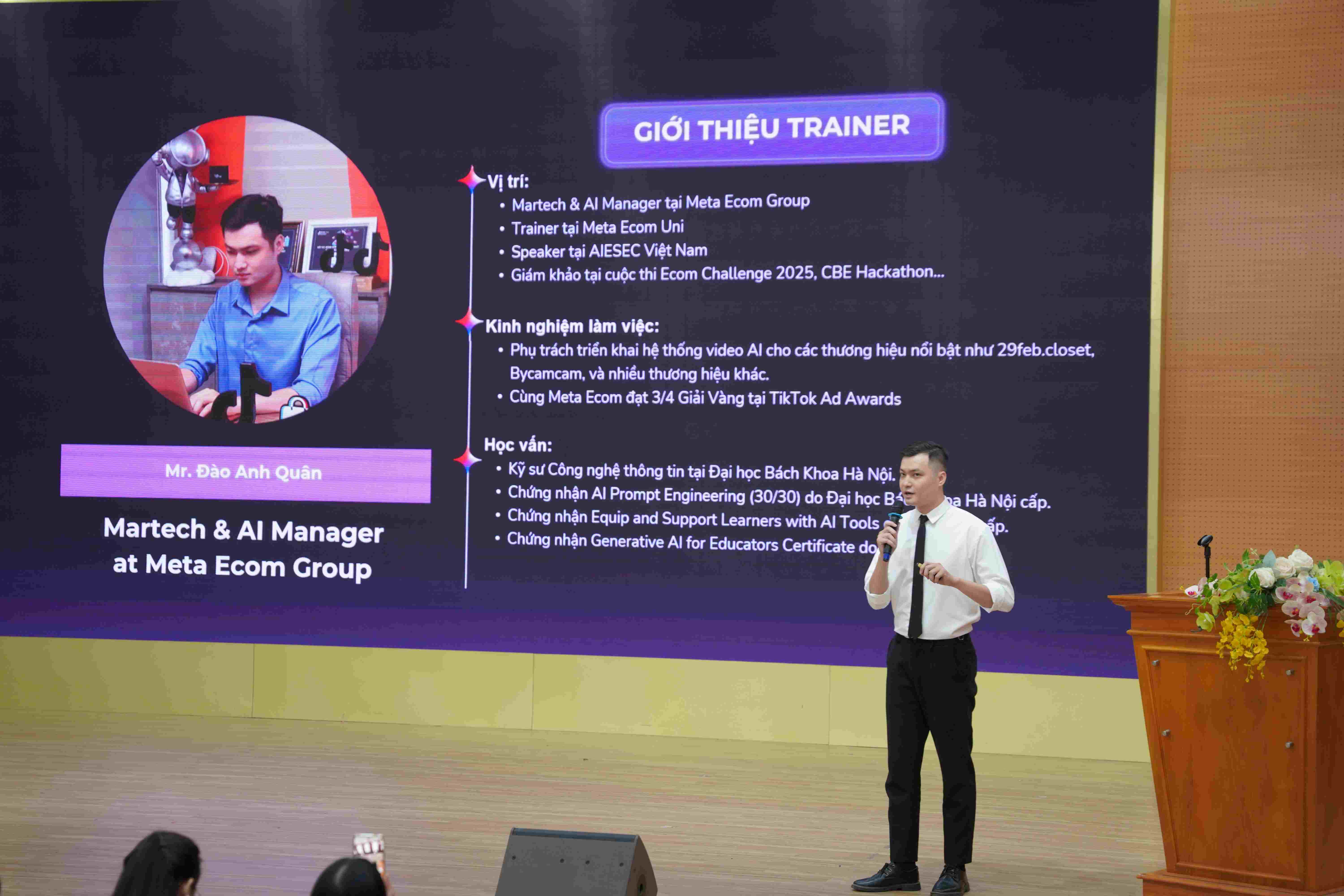 Trong chuyên đề “Bứt phá với ứng dụng AI – Tái định hình kinh doanh số”, anh Đào Anh Quân – AI & Martech Manager tại Meta Ecom Digital – đã mang đến nhiều góc nhìn mới mẻ về việc ứng dụng trí tuệ nhân tạo trong hoạt động kinh doanh và tiếp thị. Anh nhấn mạnh, AI không chỉ giúp doanh nghiệp tối ưu hiệu quả vận hành mà còn mở ra những mô hình kinh doanh sáng tạo, định hình lại cách thương hiệu kết nối với khách hàng. Đây là cơ hội để thế hệ trẻ dấn thân, làm chủ công nghệ và bứt phá trong kỷ nguyên số.