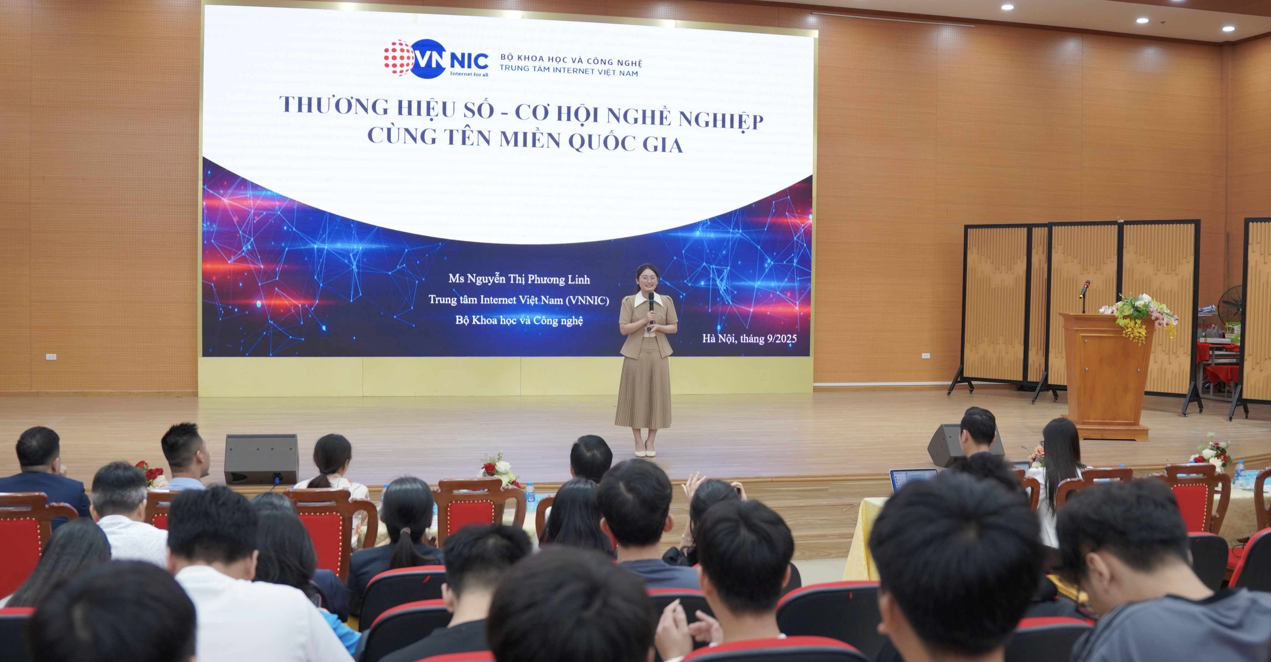 Chị Nguyễn Thị Phương Linh đại diện Trung tâm Internet Việt Nam thuộc Bộ Khoa học và Công nghệ đã nhấn mạnh tầm quan trọng của việc xây dựng thương hiệu cá nhân trong kỷ nguyên số. Với công cụ id.vn, sinh viên có thể sở hữu một “danh thiếp số” uy tín, giúp khẳng định giá trị bản thân trên môi trường trực tuyến. Đây không chỉ là bước khởi đầu để tạo dấu ấn cá nhân mà còn là “tấm vé vàng” để sinh viên tự tin bước vào thị trường việc làm cạnh tranh, nơi nhà tuyển dụng đánh giá cao sự chuyên nghiệp và khả năng hiện diện số của ứng viên.