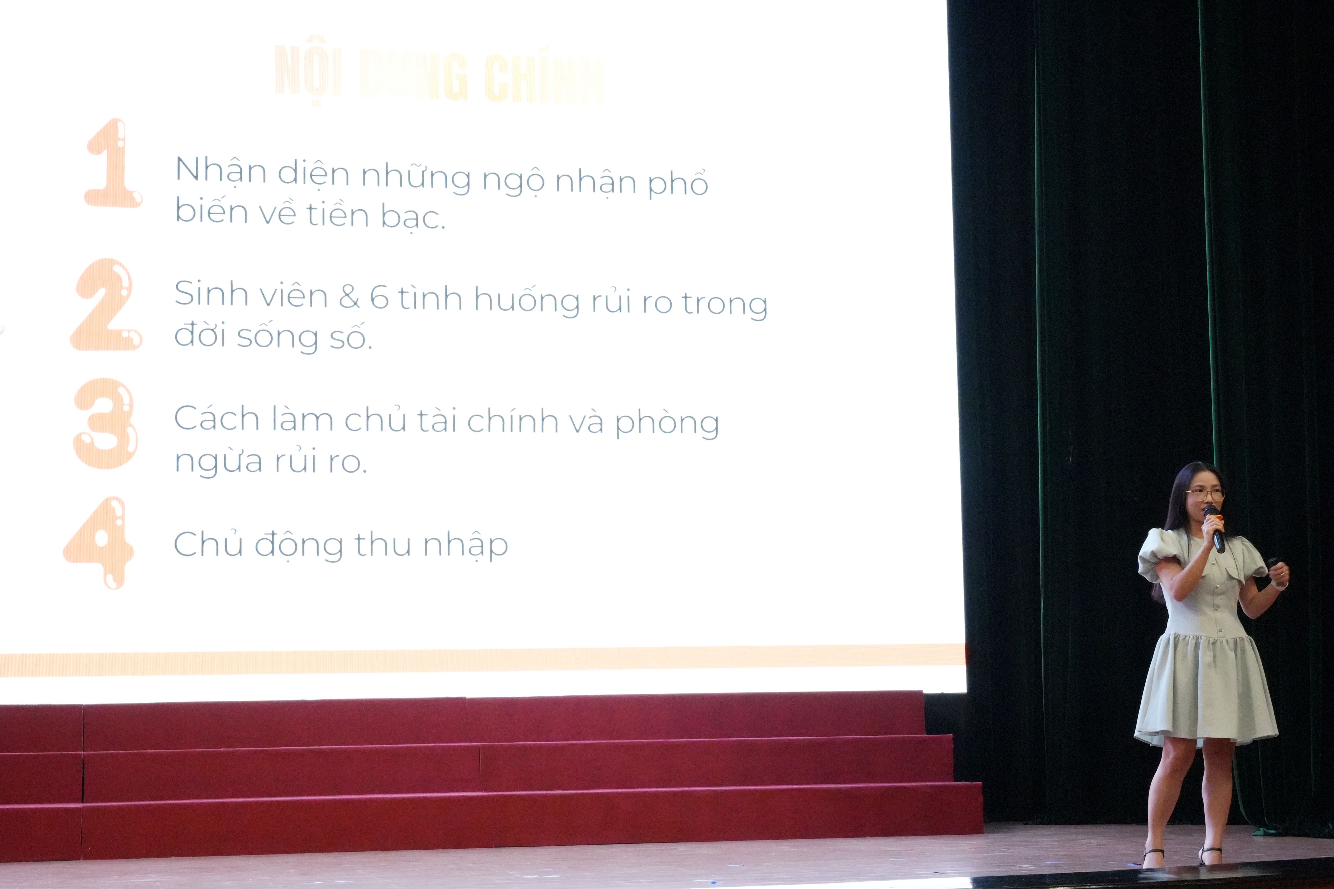 Trong bài chia sẻ, chị Phạm Thị Phương, Phó Giám đốc Marketing Tổng Công ty Cổ phần Bảo hiểm Sài Gòn - Hà Nội đã đưa ra những lời khuyên thiết thực giúp sinh viên biết cách quản lý tài chính cá nhân một cách khoa học, đồng thời cảnh giác trước những rủi ro trên môi trường số. Từ câu chuyện chi tiêu hợp lý, lập kế hoạch tài chính đến các vấn đề an toàn khi giao dịch trực tuyến, chị đã cung cấp cho sinh viên kiến thức nền tảng để bảo vệ bản thân và chủ động hơn trong quản lý tài chính. Đây là kỹ năng thiết yếu không chỉ trong thời sinh viên mà còn cho sự nghiệp lâu dài sau này.