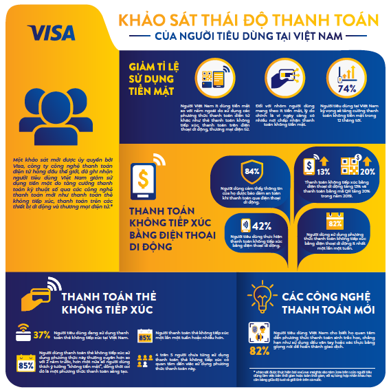 TP.Hồ Chí Minh, ngày 22 tháng 5, 2020– Một khảo sát mới được ủy quyền bởi Visa, công ty công nghệ thanh toán điện tử hàng đầu thế giới, đã ghi nhận người tiêu dùng Việt Nam giảm sử dụng tiền mặt do tăng cường thanh toán kỹ thuật số qua các công nghệ thanh toán mới như thanh toán thẻ không tiếp xúc, thanh toán trên các thiết bị di động và thương mại điện tử[1].