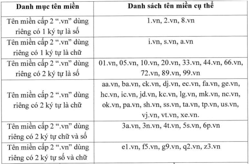 Theo danh mục mới được ban hành, 50 tên miền .VN sẽ được đấu giá trong năm 2022 thuộc 6 danh mục: Tên miền cấp 2 .VN dùng riêng có 1 ký tự là số; tên miền cấp 2 .VN dùng riêng có 1 ký tự là chữ; tên miền cấp 2 .VN dùng riêng có 2 ký tự là số; tên miền cấp 2 .VN dùng riêng có 2 ký tự là chữ; tên miền cấp 2 .VN dùng riêng có 2 ký tự là chữ và số; và tên miền cấp 2 .VN dùng riêng có 2 ký tự số và chữ.