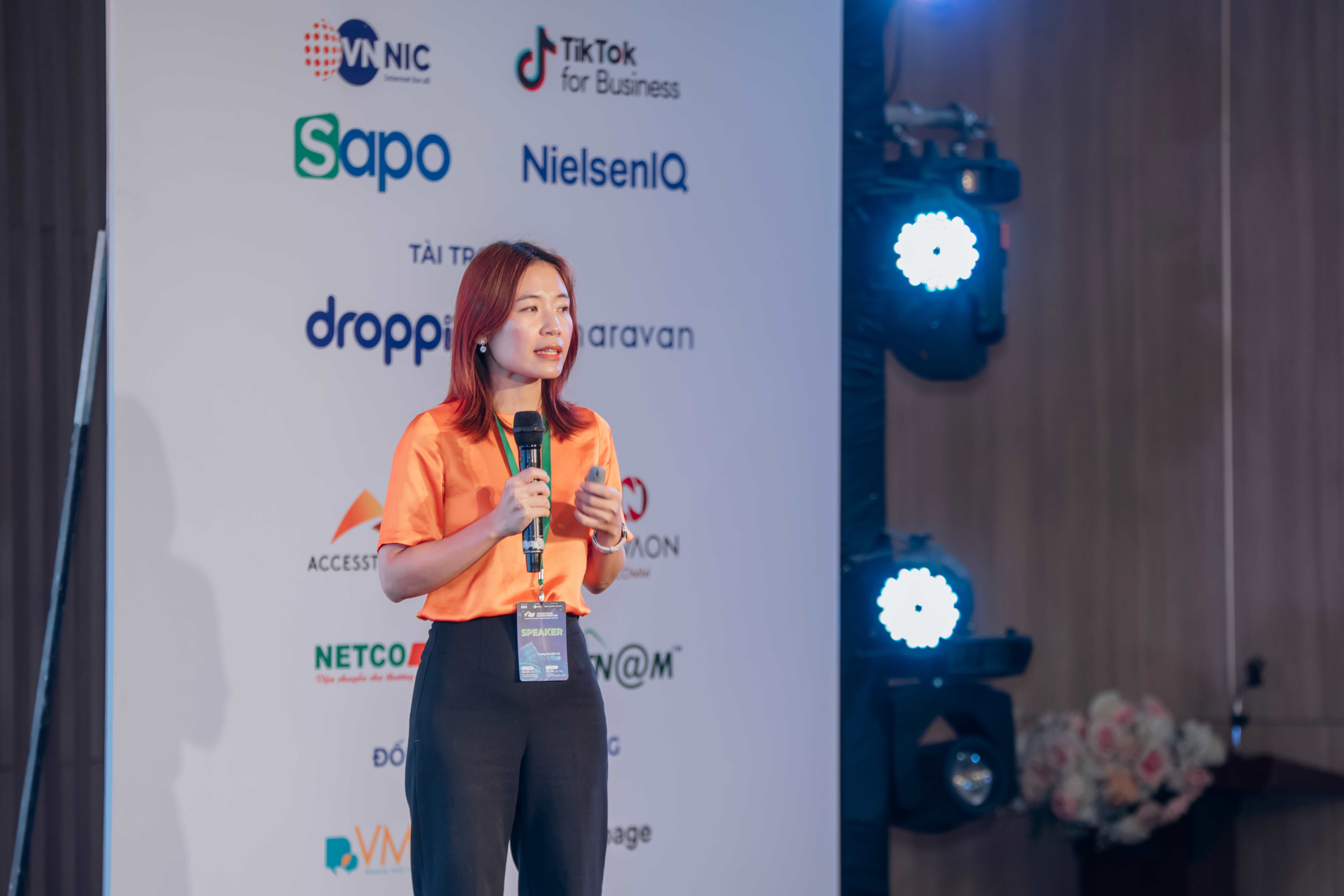 Bà Lê Minh Trang - Quản lý cấp cao Bộ phận Nghiên cứu Bán Lẻ NIQ, chia sẻ chủ đề "Nghiên cứu thị trường về xu hướng hành vi tiêu dùng trên thương mại điện tử 2024" tại Phiên 1