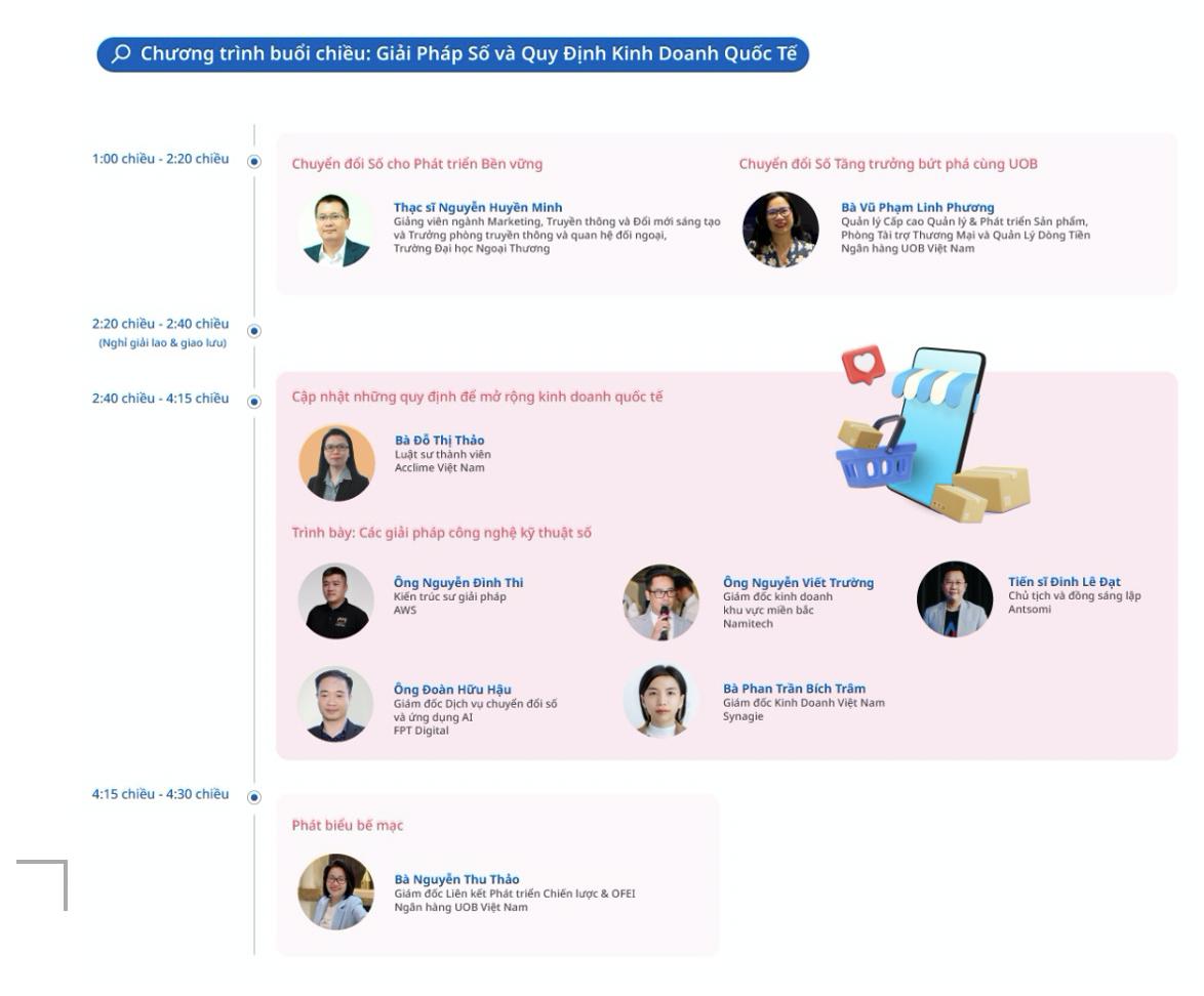 Doanh nghiệp tham gia sẽ được trang bị kiến thức về hiệu quả của việc áp dụng công nghệ, phát triển chiến lược thương mại điện tử xuyên biên giới, và được cập nhật những quy định pháp lý về thương mại bền vững để mở rộng kinh doanh ra thị trường quốc tế.