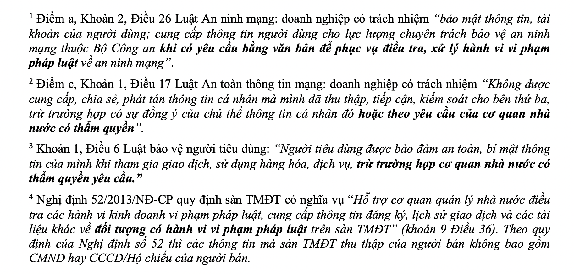 Luật An ninh mạng, Luật An toàn thông tin mạng, Luật bảo về quyền lợi người tiêu dùng, Nghị định 52/2013/NĐ-CP về thương mại điện tử đều yêu cầu doanh nghiệp phải có trách nhiệm bảo mật thông tin khách hàng và chỉ được phép chia sẻ cho bên thưa ba nếu được sự đồng ý của chỉ thể thông tin hoặc có yêu cầu cụ thể từ cơ quan nhà nước có thẩm quyền. Trong bối cảnh quản lý thuế, "yêu cầu cụ thể" xảy ra khi cơ quan quản lý thuế phát hiện cá nhân nhất định kinh doanh trên sàn TMĐT đã có hành vi vi phạm rõ ràng hoặc có dấu hiệu vi phạm pháp luật về thuế.